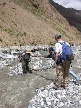 Minette gets a hand from our guide at a stream crossing, while Matt
