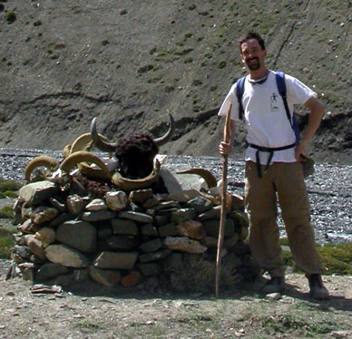 Matt next to some sort of shrine, with a yak-head and many sheep's horns