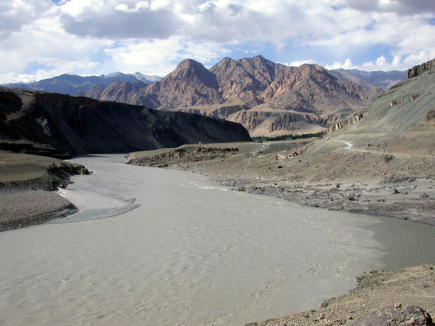 The confluence of the Zanskar (gray) and Indus (brown) Rivers. Though