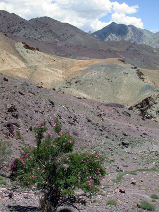At the Dung Dung La the beauty and majesty of the mountains around us were overwhelming. The barren mountains were all coloured crazily with purples and magentas and browns and dark cyan and green. Looking in one direction the mountains have soft, smooth, and gentle slopes, but turning around one sees sharp jagged shapes that seem deadly and ferocious. From here we had views of the Ladakh range and the Stok range.