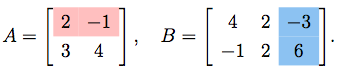 | We add matrices $A, B \in M_{m \times n}(\mathbb{R})$ entry-by-entry: $$A + B \ = \ [a_{j , \, k}] + [b_{j , \, k}] \ = \ [a_{j , \, k} + b_{j , \, k}].$$ In particular, $A + B$ is defined only when both $A$ and $B$ are $m \times n,$ i.e., have the same shape, and then $A + B$ also has the same shape since it is $m \times n$. For example, $$\left[\begin{array}{ccc} 1 & 2 & 3 \\ -3 & 4 & -1 \\ \end{array}\right] + \left[\begin{array}{ccc} 4 & -1 & 1 \\ 2 & -4 & -1 \\ \end{array}\right]\ = \ \left[\begin{array}{ccc} 5 & 1 & 4 \\ -1 & 0 & -2 \\ \end{array}\right].$$ | We define the scalar multiple of $k \in \mathbb{R}$ and $A \in M_{m \times n}(\mathbb{R})$ by $$k A \ = \ k [a_{j , \, k}] \ = \ [k a_{j , \, k}].$$ Thus each entry in $A$ is multipled by $k;$ in particular, the scalar multiple $k A$ of an $m \times n$ matrix $A$ also is $m \times n,$ so scalar multiplication preserves shape since the scalar multiple $k A$ is again $m \times n$. For example, $$3 \left[\begin{array}{cc} 1 & 2 & 3 \\ -3 & 4 & -1 \\ \end{array}\right]\ = \ \left[\begin{array}{cc} 3 & 6 & 9 \\ -9 & 12 & -3 \\ \end{array}\right].$$ |