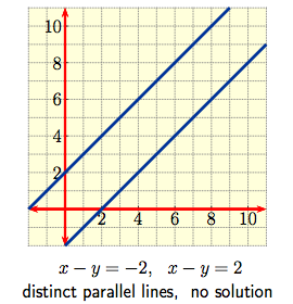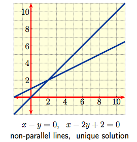 The case $m = n = 2$ is a pair of simultaneous linear equations $$a_{1,1} x + a_{1,2} y \ = \ b_1\,, \qquad \qquad a_{2,1} x + a_{2,2} y \ = \ b_2\,, $$ in $2$ variables which can be thought of graphically as a pair of straight lines in the plane. The solution set then consists of the point(s) of intersection, if any, of the lines. The various possibilities are shown below.