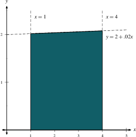 The answer in Example 2 is a little bit too small, since the curve goes up from $y=2.02$ at $x=1$ to $y=2.08$ at $x=4$. If we wanted an overestimate of the area, we would use the value of $f(x)$ at the right endpoint instead: $(4-1)f(4)=3(2.08)=6.24$. And if we wanted a more accurate guess, we might use the midpoint $f(2.5)=2.05$ and estimate the area as $(4-1)f(2.5)=3(2.05)=6.15$. But whether you use the left endpoint, the right endpoint, or the midpoint, you get roughly the same answer, since the function just isn't changing very much between $x=1$ and $x=4$. So how do you find the area under a curve that is changing a lot? For instance, how would you find the area under $y=x^2$ between $x=-1$ and $x=1$? The answer is to break the interval $[-1,1]$ up into pieces, each so small that the function doesn't change much in that piece. Then add up the pieces to get a good estimate of the total. As with most of calculus, the exact answer is then the limit of these approximate answers.