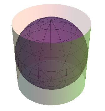 Recall first some known results: But if the cylinder exactly circumscribes the sphere as shown to the right, i.e, the cylinder and the sphere have the same radius and height, then $h = 2R$. In this case, both the sphere and circumscribing cylinder have equal surface area $4\pi R^2$. Even though this result is clear on the basis of computation, does it seem obvious geometrically? |