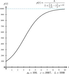 When there are limits on the food supply, the population is often governed by the logistic equation: $$ \frac{dp}{dt} = c p (L-p),$$ where $c$ and $L$ are constants. The population grows exponentially for a while, and then levels off at a horizontal asymptote of $L$.