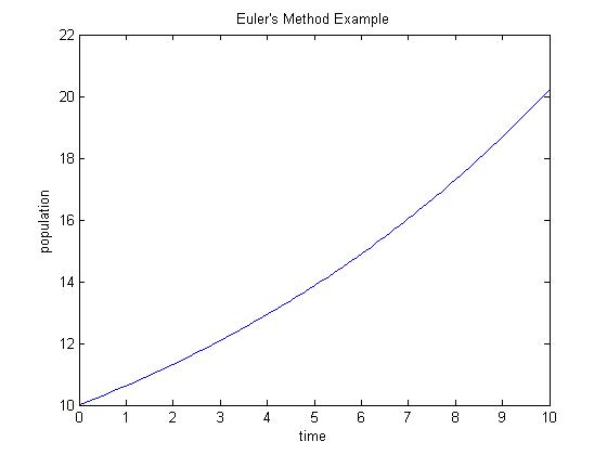 This command passes the following parameters to the m-file Eulers; tmax = 10, N = 100, $r=0.1$, $h=0.2$, and $y_0=10$. Here, [0, tmax] is the time interval used and $N$ is the number of time steps used (so $\Delta t$ = tmax/N). Once you have entered your command and pressed enter, you should get something like the following plot: