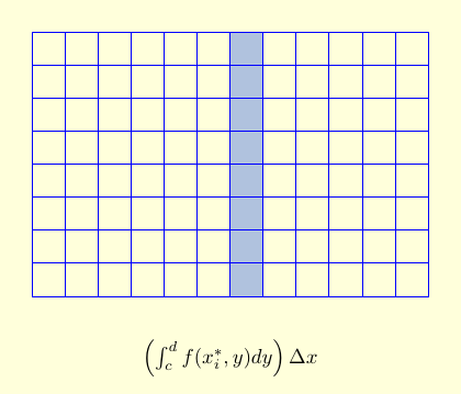 | $\displaystyle\sum_{j=1}^n f\left(x_{i}^*,y_{j}^*\right) \,\Delta y\, \Delta x$ is the approximate contribution of all the boxes in a single column. As $n \to \infty$, the sum over $n$ turns into an integral, and we get $$\displaystyle\left (\int_c^d f\left(x_i^*, y\right)\,dy \right )\, \Delta x.$$ |