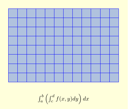 | Adding up the columns then gives $\displaystyle\sum_{i=1}^m \left (\int_c^d f\left(x_i^*, y\right)\, dy \right )\, \Delta x$. Taking a limit as $m \to \infty$ turns the sum into an iterated integral: $$\int_a^b \left ( \int_c^d f(x,y)\, dy \right ) \,dx.$$ |