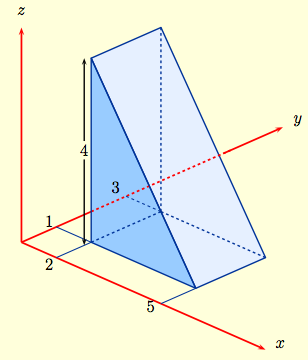$x$-$y$ plane and the plane $z=\frac{4}{3}(5-x)$ and above $R$. To