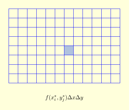 One Variable at the TimeNow that we know what double integrals are, we can start to compute them. The key idea is: One variable at a time! In order to integrate over a rectangle $[a,b] \times [c,d]$, we first integrate over one variable (say, $y$) for each fixed value of $x$. That's an ordinary integral, which we can do using the fundamental theorem of calculus. We then integrate the result over the other variable (in this case $x$), which we can also do using the fundamental theorem of calculus. So a 2-dimensional double integral boils down to two ordinary 1-dimensional integrals, one inside the other. We call this an iterated integral. There are two ways to see the relation between double integrals and iterated integrals. In the bottom-up approach, we evaluate the sum $$\sum_{i=1}^m \sum_{j=1}^n f\left(x_{i}^*,y_{j}^*\right) \,\Delta x\, \Delta y,$$ by first summing over all of the boxes with a fixed $i$ to get the contribution of a column, and then adding up the columns. (Or we can sum over all of the boxes with a fixed $j$ to get the contribution of a row, and then add up the rows.)