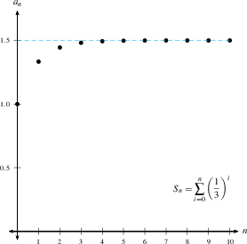 For example, the series $$ \sum_{i=0}^\infty\left(\frac{1}{3}\right)^i=1+\frac13+\frac19+\frac{1}{27}+\ldots $$ is geometric with ratio $r=\frac13$. |