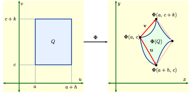 Then $${\bf u} \ = \ {\bf \Phi}(a+h,\,c) - {\bf \Phi}(a,\,c)\,, \qquad {\bf v} \ = \ {\bf \Phi}(a,\,c+k) - {\bf \Phi}(a,\,c)\,.$$ The area of the parallelogram spanned by ${\bf u} = u_1 {\bf i} + u_2 {\bf j}$ and ${\bf v} = v_1 {\bf i} + v_2 {\bf j}$ is the determinant $\left | \begin{matrix} u_1 & v_1 \cr u_2 & v_2 \end{matrix}\right |$.