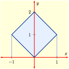 | Example 2b: Use an appropriate transformation $${\bf \Phi} : (u,\, v) \ \longrightarrow \ \bigl(\,x(u,\, v),\ y(u,\, v)\, \bigr)$$ to evaluate the integral $$ I \ = \ \int\int_D\ (x+y) \, dx dy$$ when $D$ is the square having corner points $$(0,\,0)\,, \ \ (1,\, 1)\,, \ \ (0,\, 2)\,, \ \ (-1,\, 1)\,.$$ as shown to the right. |