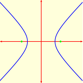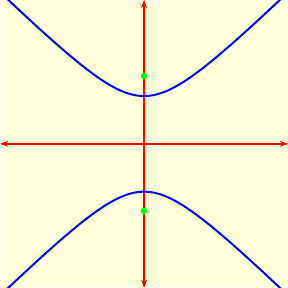 | The standard rectangular formulas for hyperbolas are $$\frac{x^2}{a^2} - \frac{y^2}{b^2} = 1$$and$$\frac{y^2}{a^2} - \frac{x^2}{b^2}=1.$$The first has foci at $(\pm c, 0)$, where $$c^2 =a^2 + b^2$$ (instead of $a^2-b^2$ for an ellipse), and the second has foci at $(0, \pm c)$. As before, the ratio $c/a$ is called the eccentricity, only now it is bigger than 1. |