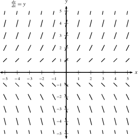 Examples: The direction fields of $$\displaystyle\frac{dy}{dx} = x+y,\qquad \displaystyle\frac{dy}{dx} = 2x, \quad\text{ and } \quad \displaystyle\frac{dy}{dx}=y,$$ are (respectively)