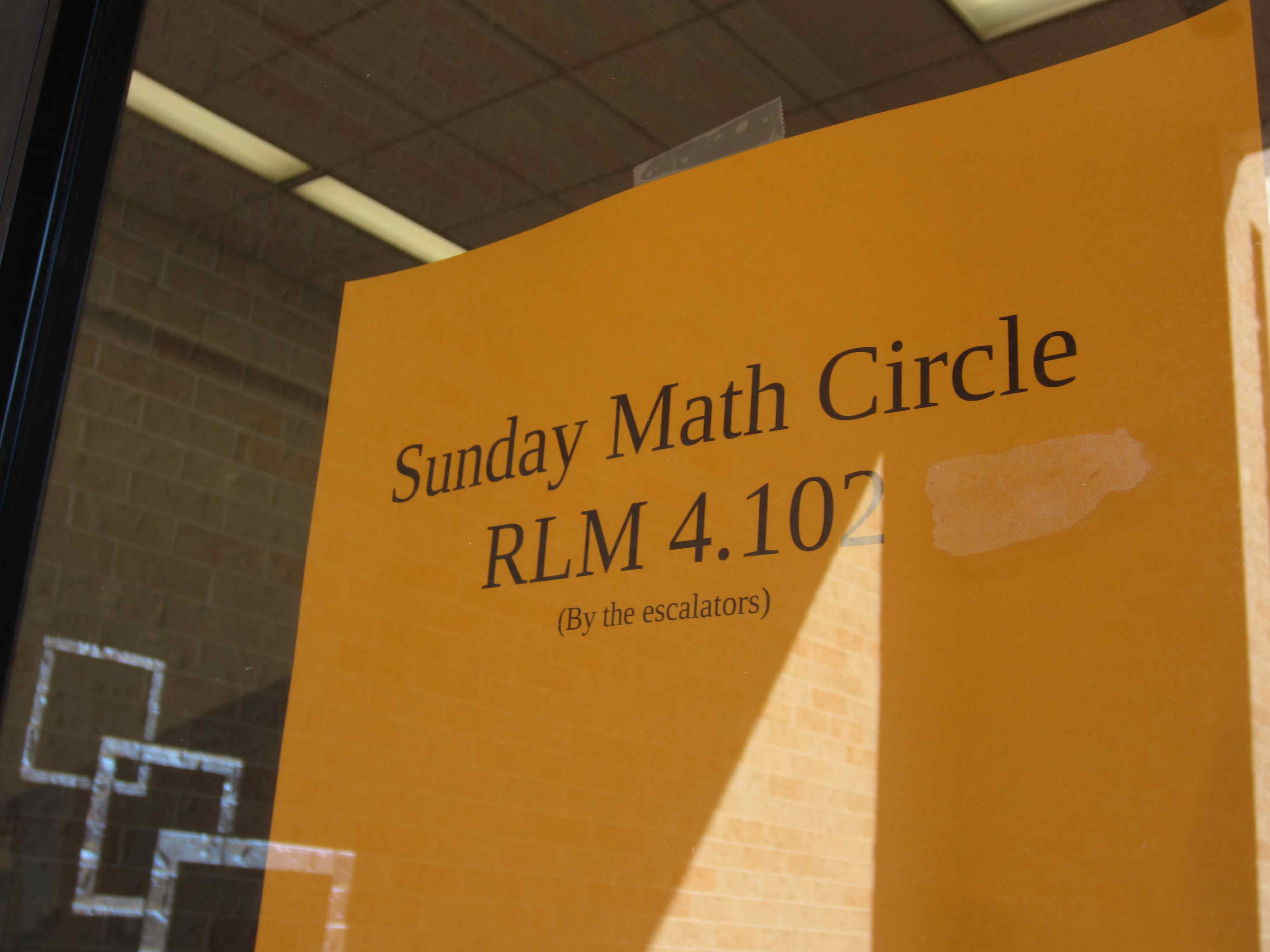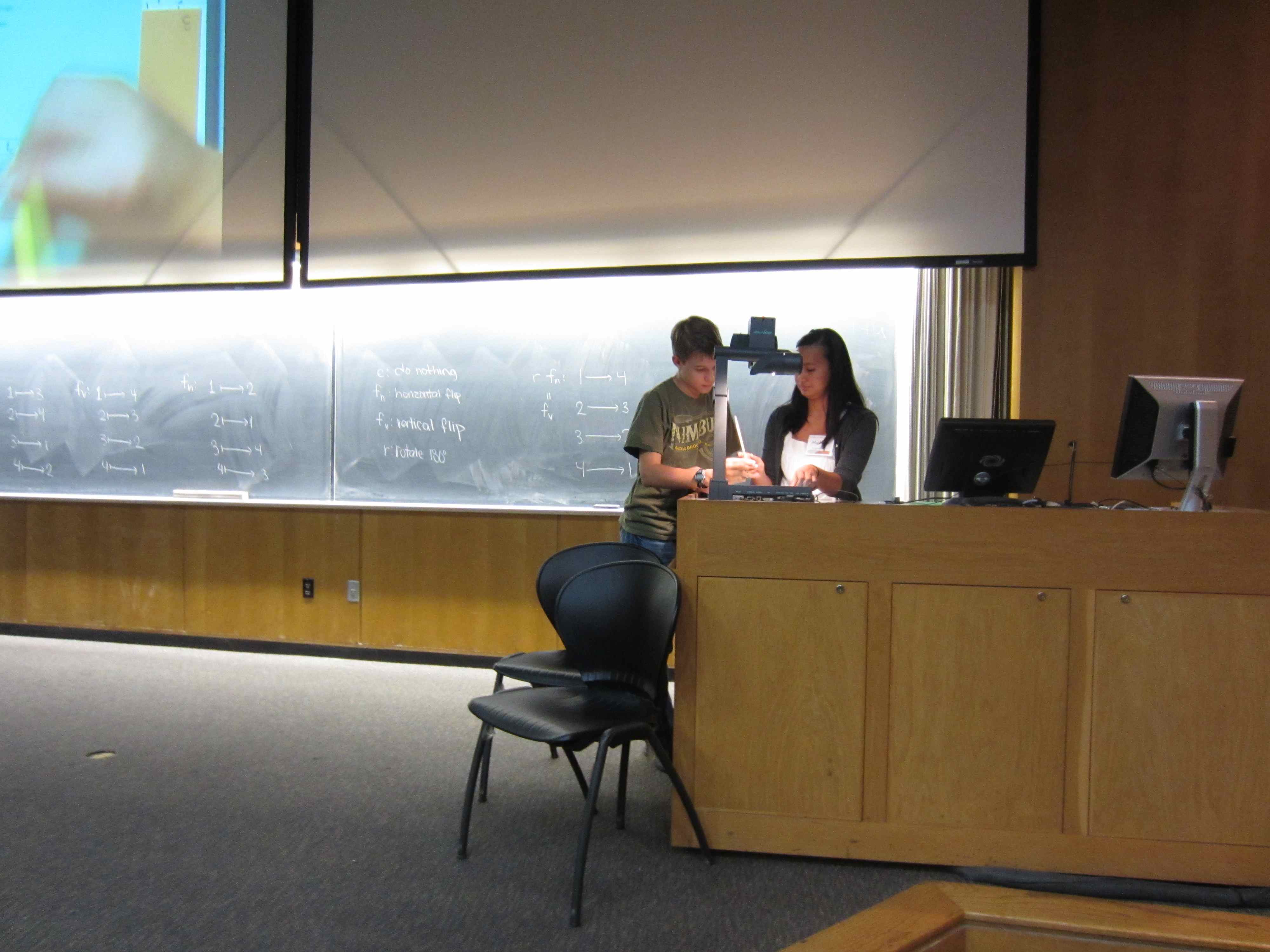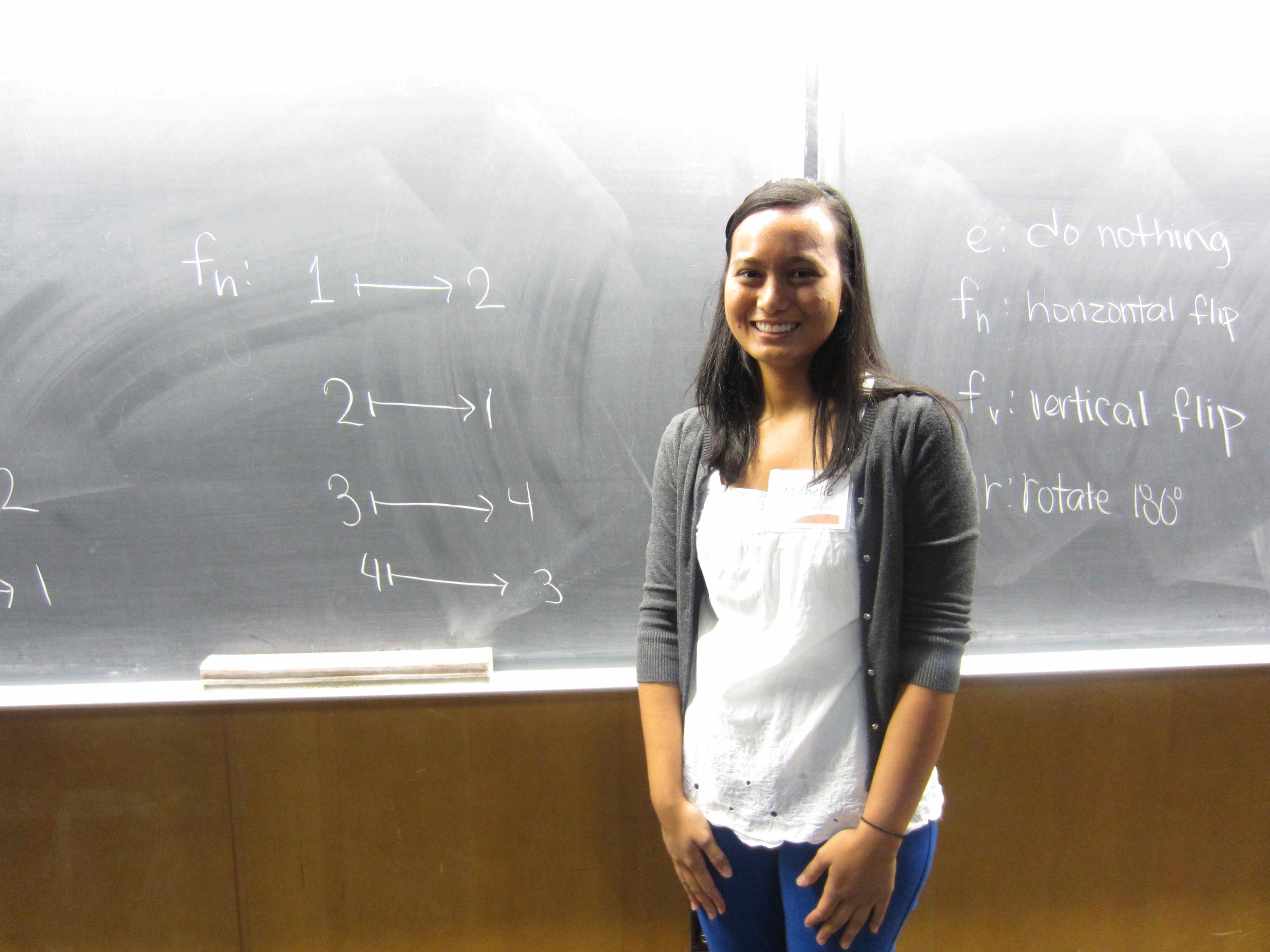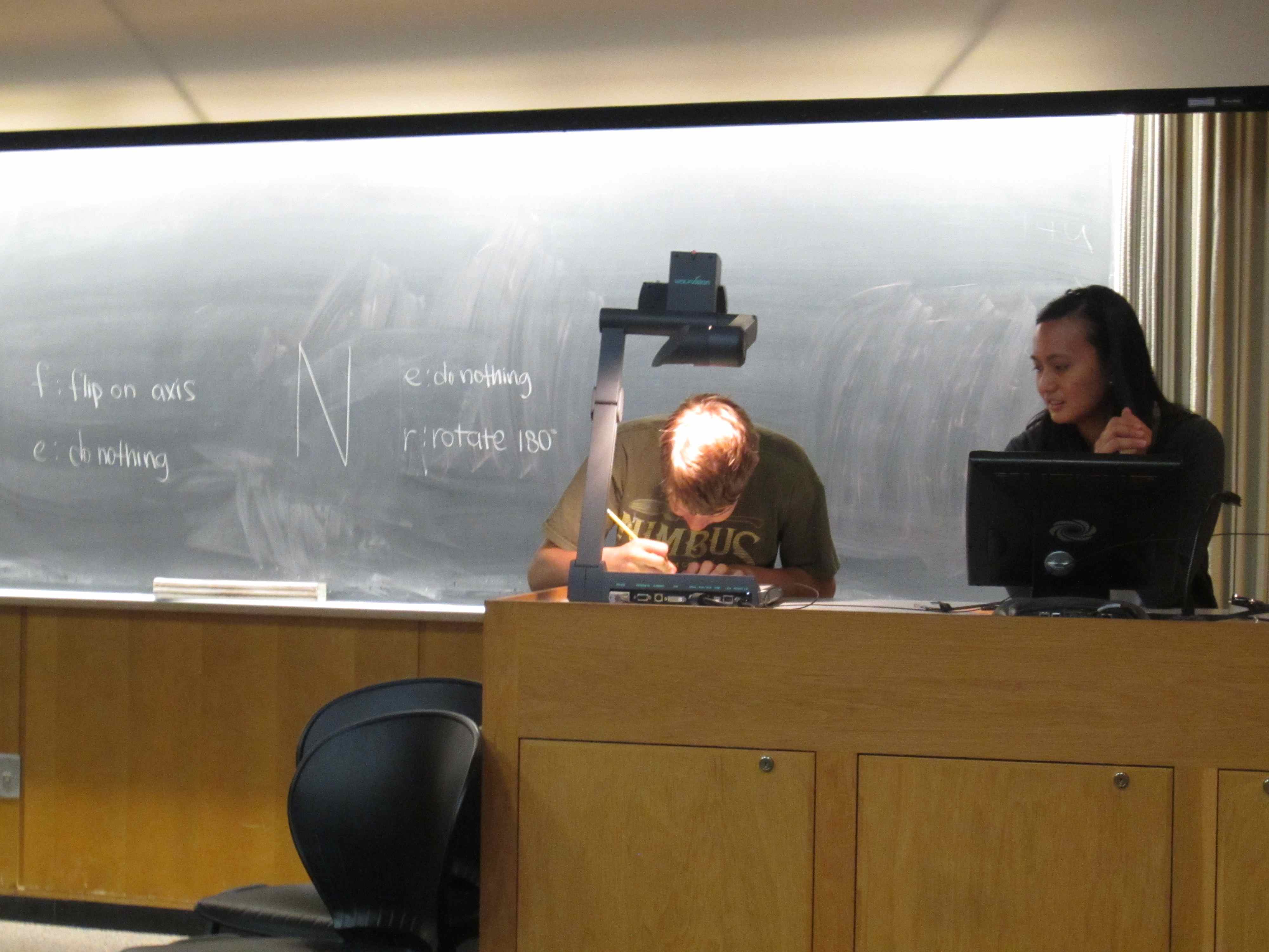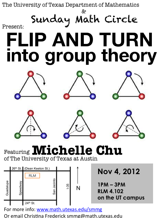 On Sunday November, 4 2012, Michelle Chu led a discussion about rotations, symmetries, and group theory to an audience of about 40 students and parents. We used basic properties of groups and reflectional and rotational symmetries to complete the Cayley tables for the rectangle and the triangle.